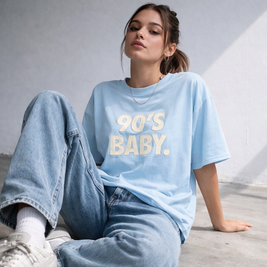 Oversized βαμβακερό t-shirt σε σιελ βάση με “90’s BABY” cream απλικέ.