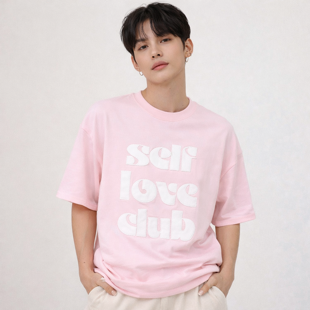 Oversized βαμβακερό t-shirt σε απαλό ροζ με minimal “self love” typography.